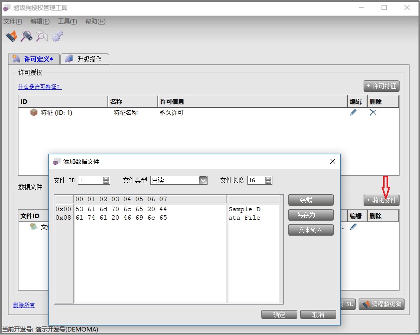 點擊“數據文件”添加,數據文件支持只讀、讀寫和寫一次三種方式,文件長度最多不能超過1024字節。添加完以后按確定保存。