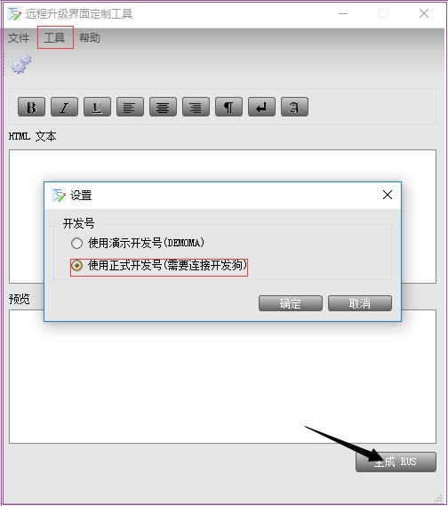 插上主鎖,在上面菜單的工具中選擇正式開發號,點“生成RUS”會生成一個專用的遠程升級工具。如果需要在界面中顯示一些特殊的信息,可以“HTML文本”中自行輸入。