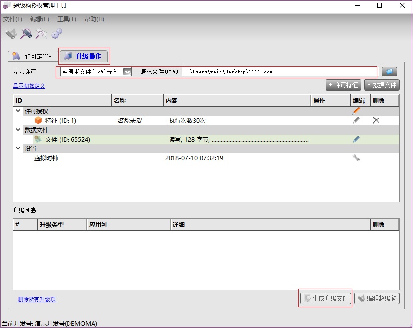 在升級操作界面,將用戶端傳來的c2v文件導入,導入后會看到界面中有關用戶端超級狗的詳細信息,對這些信息加以修改,如增加使用次數、延長到期時間、修改存儲區數據等,全部設置完畢后,點擊“生成升級文件”,會產生一個擴展名為v2c的升級激活文件,將此文件發給用戶。