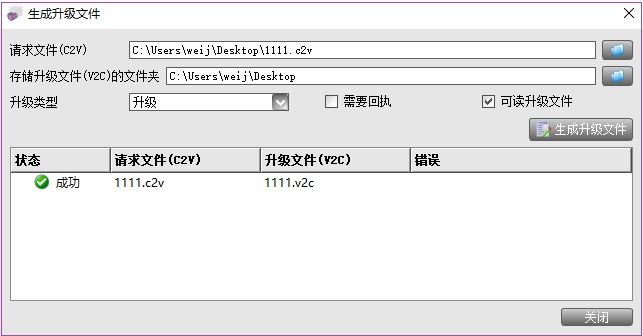 用戶運行這個RUS升級工具后,插上需要遠程升級的超級狗,點“生成升級請求文件”,系統會保存一個擴展名為.c2v的文件,將此文件發回軟件開發商