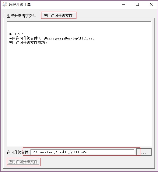 用戶還是在RUS工具里面,加載這個回傳的v2c文件,插上對應的超級狗,點“應用許可升級文件”完成升級。