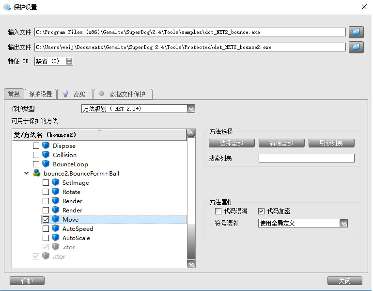 3、用超級狗外殼工具對此demo程序進行外殼加密,加密時選擇對move()做代碼加密。