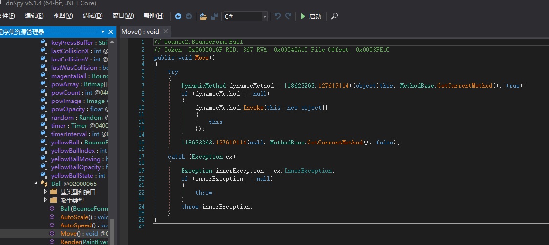 把dot_NET2_bounce.exe拖進反編譯工具.NET Reflector 8.5,可以清楚地看到move()方法的代碼。