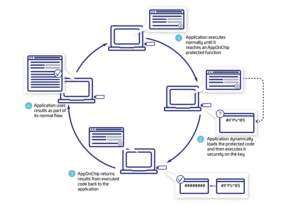 在運行時,受保護的應(yīng)用程序?qū)⒓用艽a上傳到硬件密鑰,在密鑰中解密并安全執(zhí)行,避免調(diào)試器等破解工具的攻擊。